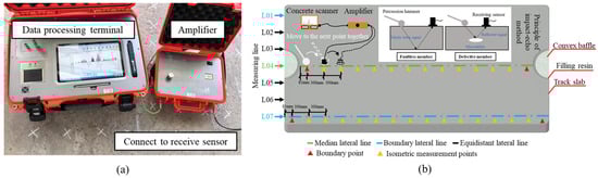 As shown in Figure 1a, the impact-echo testing equipment consists of a data processing terminal, an amplifier, receiving sensors, and excitation devices. The experimental scheme for detecting internal voids in the track slab using the impact-echo method is illustrated in Figure 1b. Measurement lines were arranged longitudinally along the track slab, while transverse measuring lines 01–07 were evenly spaced at intervals of 300 mm across the slab. Lines 01 and 07, designated as boundary lines, were positioned 150 mm away from the slab edges, while line 04 was the central measuring line. Measurement points were distributed along the measuring lines at equal intervals of 300 mm. Due to dimensional constraints of the track slab, boundary measurement points were located 81 mm from the slab ends. Additionally, due to the slab design, which included reserved spaces for protruding end stops and filling resin, the central measuring line (line 04) contained two fewer points than the other measuring lines.