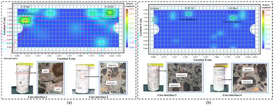 Cloud image of inner cavity of track slab and local cavity image of drill core sample. (a) Used slab apparent strength and drill core diagram. (b) New slab apparent strength and core drilling diagram.