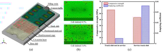 Performance comparison of old and new slabs and finite element simulation model. (a) Finite element analysis model of slab-type ballastless track. (b) Meshing comparison. (c) Corresponding relationship between compressive strength and emptying coefficient of new and old track slabs.