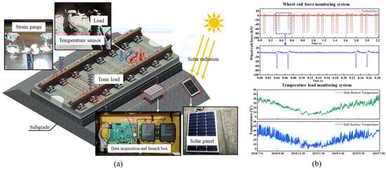 Field monitoring scheme. (a) Track online monitoring system. (b) Train load and temperature monitoring results.