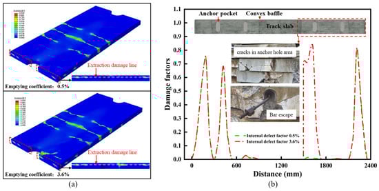 The initial defect locations within the new track slabs primarily stem from inadequate concrete compaction during vibration, as well as void damage caused by pressing or collisions during demolding and transportation. The extent of these voids is approximately 0.5%, indicating relatively good overall uniformity. Under the sustained effects of temperature and train loads, these defect locations will experience stress concentration first, leading to localized voids and cracking typical of damage accumulation processes. The overall damage of the track slab gradually extends along weak paths, with the overall void coefficient of the aged slabs reaching 3.6%. The increase in the internal void coefficient inevitably leads to issues such as decreased strength, degraded stiffness, and altered load transfer mechanisms, all of which affect the safe and stable operation of trains. This study aims to quantify the performance evolution of track slabs based on the number of voids, facilitating research into damage localization and evolution patterns under service conditions, and enabling the analysis of load-bearing capacity for slabs exceeding maintenance standards.