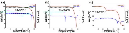TGA and DSC curves of (a) TCZT, (b) TIDT, and (c) TDBCZT, the dash lines indicating the compounds with a 5% weight loss.