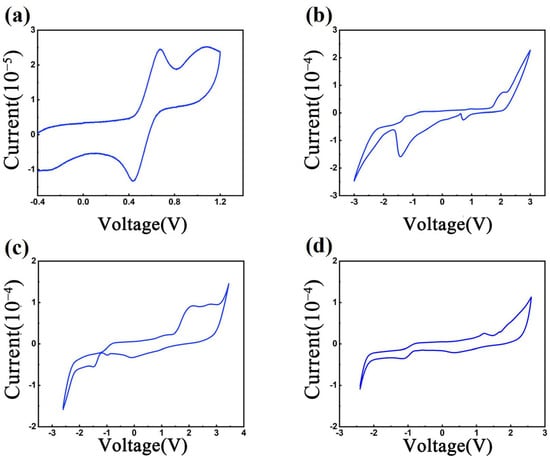 Cyclic voltammetry (CV) was employed to characterize the electrochemical properties of the compounds. Figure 2a showed the CV curve of Fc/Fc+ system. The half-wave potential of Fc/Fc+ (E1/2,FOC) was determined to adjust the reference electrode for calibration purposes [32], and the value of E1/2,FOC was 0.56 V. Figure 2b–d showed the CV curves of TCZT, TIDT, and TDBCZT. The oxidation peak for TCZT occurred at 2.09 V, with an onset oxidation potential of 1.42 V. In contrast, TIDT exhibited an oxidation peak at 2.15 V and an onset oxidation potential of 1.67 V. The reduction peak for TCZT was observed at −1.42 V, whereas the peak for TIDT was identified at −1.50 V. Therefore, both of them were irreversible redox processes [33]. Different from the previous two, the oxidation peak for TDBCZT occurred at 1.23 V, with an onset oxidation potential of 0.67 V, while the reduction peak was observed at −1.17 V. Therefore, the redox process of TDBCZT was deemed to exhibit quasi-reversible characteristics. The HOMO energy levels of TCZT, TIDT, and TDBCZT were calculated as −5.67 eV, −5.92 eV, and −4.92 eV, respectively. The LUMO energy levels were calculated based on their optical band gaps and were determined to be −2.49. eV, −2.27 eV, and −2.11 eV, respectively [34].