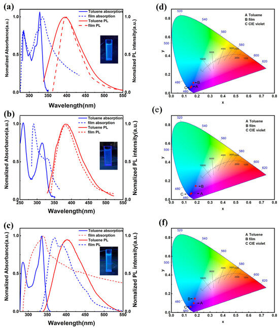 Normalized UV–Vis absorption and PL spectra of (a) TCZT, (b) TIDT, and (c) TDBCZT in toluene and films. The CIE1931 coordinates of (d) TCZT, (e) TIDT, and (f) TDBCZT. The insets in the middle-right section of figures (a–c) illustrating the fluorescence emission of the corresponding compounds (at a concentration of 10−6 M in toluene) inside a quartz cuvette when exposed to irradiation from a fluorescent lamp.