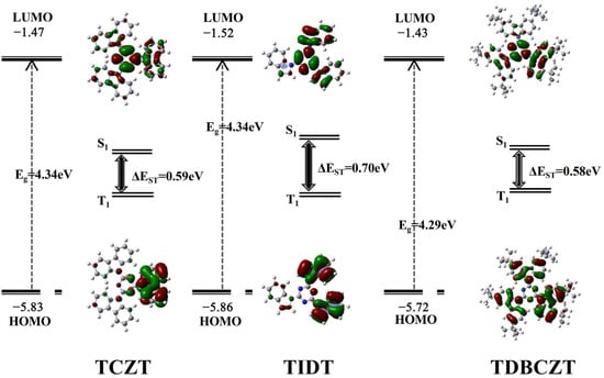 Molecular orbitals and energy diagrams using DFT for TCZT, TIDT, and TDBCZT.