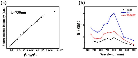 (a) The quadratic power dependence of two-photon-excited fluorescence for TCZT when the excitation wavelength is set to 730 nm. (b) δ values of TCZT, TIDT, and TDBCZT at different excitation wavelengths.