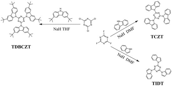 This research presents the syntheses and comprehensive characterization of a set of D-A triazine-based molecules exhibiting violet-blue emission, specifically TCZT, TIDT, and TDBCZT (Scheme 1). Notably, the synthesis and characterization methods employed herein differ significantly from conventional approaches [23,24]. Specifically, the target compounds were obtained via a catalyst-free aromatic nucleophilic substitution reaction, as illustrated in Scheme 1. This one-step synthesis method yielded all compounds with high efficiency and ensured that the final products met the desired functional requirements.