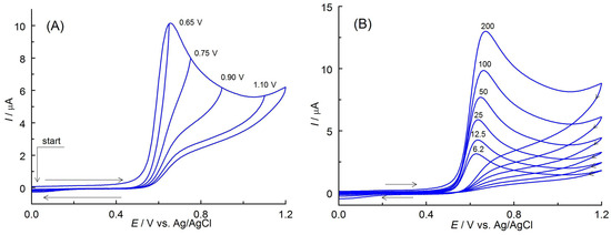 Cyclic voltammograms (CVs) of apocynin obtained in PBS (pH 7.3) containing 5% (v/v) ethanol on BDDE showed only one oxidation peak at potentials of about 0.6 V vs. Ag/AgCl (Figure 3A). When the direction of polarization was reversed from anodic to cathodic at various potential Eλ, no reduction peak was observed up to −1.7 V vs. Ag/AgCl. This indicates that the anodic oxidation products of APO are unstable and undergo irreversible homogeneous chemical subsequent reactions. The end products of this process are non-electroactive in the available potential range. The oxidation peak potential slowly shifted positively with increasing scan rates, v (Figure 3B), which suggests the quasi-reversible behavior of the anodic process. This is also confirmed by the difference in width of the anodic peaks (Epa − Epa/2, where Epa and Epa/2 represent the anodic peak potential and the potential at the half-height of the peak, respectively). The obtained values (0.057–0.072 V in the scan rate from 6.2 to 200 mV s−1) did not differ significantly from the theoretical values predicted for the reversible one-electron transfer (0.0565 V [24]). The linear dependence of the peak current (Ip) on the square root of the scan rate (v1/2) given by the equation Ip (μA) = 1.680 v1/2 (V s−1)1/2 + 0.018 (r = 0.9999) suggests a diffusion-controlled process of the APO anodic oxidation (Figure 3C). Deviation from linearity at higher scan rates results from increased degree of irreversibility of the electron exchange reaction [25,26]. Diffusive character of this electrode process confirmed the slope of the log Ip = f(log v) plot described by the equation log [Ip (μA)] = 0.46 log [v (V s−1)] + 1.18 (r = 0.9999), as shown in Figure 3D. The obtained value of 0.46 is close to the theoretical 0.5 characteristic for this type of electrode process [26].