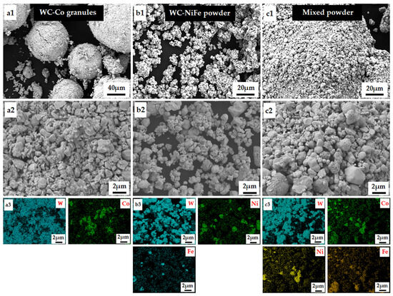 SEM images and corresponding elemental distribution maps of raw powders: (a1–a3) WC-Co granules, (b1–b3) WC-NiFe powders, (c1–c3) mixed powders.