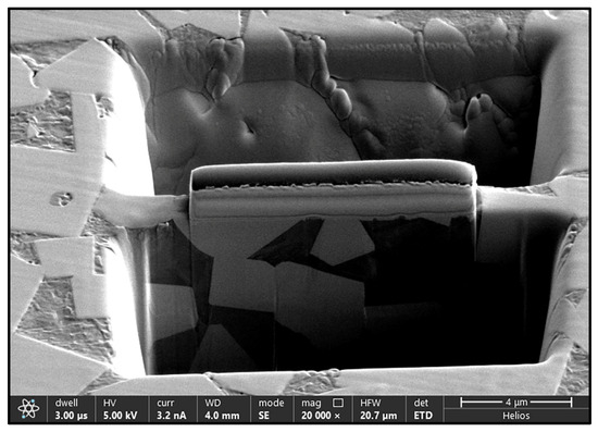 The specimens were first machined by electrical discharge machining for the microstructural characterization. The surfaces of the specimens were grinded with 2000 grit abrasive paper and then polished with a 0.5 μm diamond polishing spray. The microstructure and elemental composition were characterized using a field emission scanning electron microscope (SEM, FEI Inspect F50, Hillsboro, OR, USA) equipped with an Energy Dispersive Spectrometer (Oxford X-Max50, Oxfordshire, UK). The phases of the alloys were determined using X-ray diffraction (XRD, Bruker Advance D8, Billerica, MA, USA) with Cu Kα radiation (λ = 1.5406 Å) at a scanning angle ranging from 20° to 90°, and a scan speed of 1°/min and a scan step of 0.02 were used for the XRD measurements. The microstructures of the WC/γ-(Co, Ni, Fe) specimens’ interface were characterized by using a focused ion beam (FIB) and transmission electron microscopy (TEM, Thermo Scientific Spectra 300S, Waltham, MA, USA). An FIB system was utilized to trench a cross-section of the interfaces. As seen in Figure 2, a 5 kV Ga+ ion beam with a beam current of 3.2 nA was used to produce a 50 nm thick lamella. High-angle annular dark field imaging (HAADF) and energy dispersive spectroscopy (EDS) mapping were conducted to investigate the phase composition and elemental distribution of the specimens.