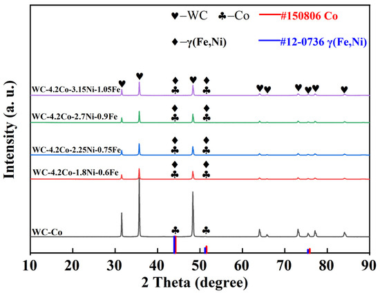 The Ni/Fe ratio was determined to be 3:1 in this study. The powders were weighed according to the designed composition and wet-milled in a roller ball mill with 2 wt.% paraffin added as a plasticizer. The specific ball milling parameters were as follows: the weight ratio of balls to material was 5:1, the grinding time was 40 h, the diameter of the balls was 6 mm, and the alcohol content with 99.9% purity was 400 mL/kg. Subsequently, the milled powders were dried in a vacuum drying oven to obtain mixed WC-NiFe powders.