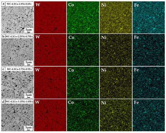 The BSE-SEM images and corresponding EDS results of the cemented carbides with Ni and Fe contents of (a) 2.4 wt.%, (b) 3 wt.%, (c) 3.6 wt.%, (d) 4.2 wt.%.