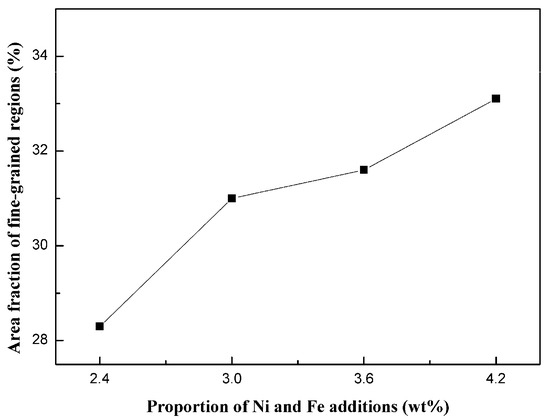 The microstructure evolution of the cemented carbides with Ni and Fe contents of 2.4 wt.%, 3 wt.%, 3.6 wt.%, and 4.2 wt.% is shown in Figure 6. The microstructure of the specimens is divided into the fine-grained region (circled by the yellow dotted lines, corresponding to WC-Co granules) and the coarse-grained region (corresponding to WC-NiFe powders), where the fine grains are uniformly embedded in the coarse-grained region, presenting a typical network mixed-grain structure. The area fraction of fine-grained regions of the WC-CoFeNi cemented carbides with varying Ni and Fe contents is shown in Figure 7. It can be seen that the total area within the dotted line increases with increasing Ni and Fe content. This indicates that the volume fraction of the fine-grained regions and the overall content of the binder phase increase. When the proportion of Ni and Fe content reaches 4.2 wt.%, the shape of the fine-grained regions becomes nearly circular, and both the number and the area of the fine-grained regions reach their maximum.