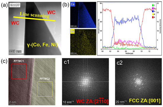 The HAADF images of the WC/γ-(Co, Ni, Fe) interface taken by the TEM are shown in Figure 8. The elemental mapping distribution and corresponding elemental scanning results are presented in Figure 8a,b, which confirm that the dark area is the binder phase whose boundaries are adjacent to the WC phase. The elemental scanning results indicate that the Fe, Ni, and Co elements are uniformly distributed in the binder during the liquid sintering process. It can be further evidenced by the fast Fourier transformation (FFT) diffractogram image in Figure 8c, which shows that the zone belongs to the WC phase, and the [001] zone belongs to the γ-(Co, Ni, Fe) phase, respectively.