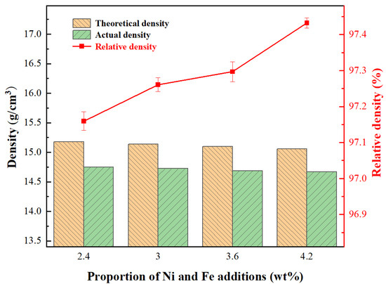 - As the Ni and Fe content increase from 2.4 to 4.2 wt.%, the actual density of cemented carbides decreases, while the average relative density increases from 97.15% to 97.43%. The addition of Ni and Fe elements contributes to reducing the melting point and prompting the diffusion coefficient of cemented carbides, which can be attributed to liquid phase sintering.