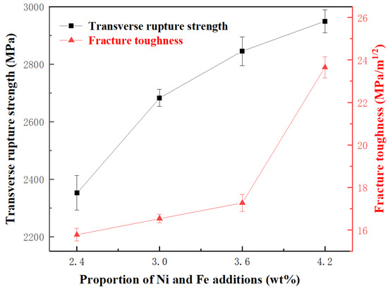 The transverse rupture strength and the fracture toughness of the specimens were measured in this study. The specimens underwent four separate lines of testing, and the average of these values was taken as the performance value. As shown in Figure 10 and Figure 11, the mechanical properties of the specimens are significantly influenced by the proportion of Ni and Fe content. The transverse rupture strength, fracture toughness, and the hardness of WC-CoNiFe cemented carbides gradually increase and reach maximum values with the increase in the proportion of Ni and Fe content. When the proportion of Ni and Fe content is 2.4 wt.%, the specimens exhibit the lowest rupture strength of 2352 MPa, the lowest fracture toughness of 15.78 MPa·m−1/2, and the lowest hardness of 1332 HV. As the proportion increases to 3 wt.%, the rupture strength of the specimen increases to 2683 MPa, the fracture toughness improves to 16.54 MPa·m−1/2, and the hardness grows to 1384 HV. When the proportion reaches 4.2 wt.%, the specimens achieve the maximum rupture strength of 2949 MPa, the maximum fracture toughness of 23.65 MPa·m−1/2, and the maximum hardness of 1430 HV.