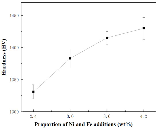 where H represents the hardness of the cemented carbides; K, a, and b are constants; ε denotes the porosity; and d is the grain size of WC. This formula signifies an inverse relationship between porosity and hardness, as well as a direct relationship between WC grain size and hardness. As depicted in Figure 7 and Figure 9, both the area fraction of fine-grained regions and the relative density show a monotonic increase with higher Ni and Fe contents. Specifically, the cemented carbides with 4.2 wt.% of Ni and Fe exhibit peak hardness values due to their refined microstructure and high relative density. This highlights the crucial role of Ni and Fe additions in inhibiting grain growth through liquid-phase sintering and in aiding pore elimination.