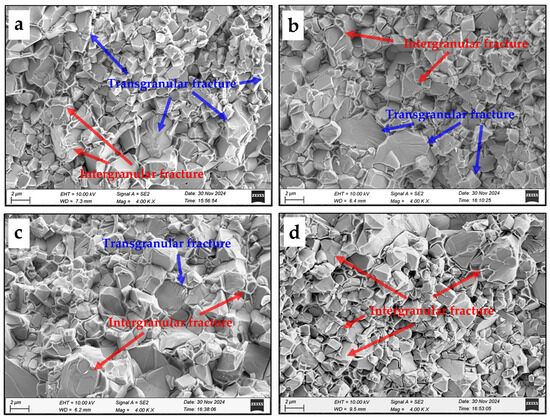 The fracture morphology in the cemented carbides with varying Ni and Fe content is illustrated in Figure 12. The SEM-EDS line scan of cemented carbides with an additional Ni and Fe content of 2.4 wt.% is shown in Figure 13. It reveals that the Co, Ni, and Fe elements are distributed within the same regions of the binder phase. Furthermore, there are two modes of crack propagation, i.e., intergranular fracture and transgranular fracture. The fracture surface in Figure 12a demonstrates a mixed morphology containing both intergranular and transgranular fracture types. Transgranular fracture occurs when the compressive stress acting on the WC grains is sufficient to induce brittle fracture. The coarser WC grains tend to generate larger compressive stress, resulting in prominent transgranular cleavage features. Figure 12b–d indicate a progressive transition in the failure mechanism with increasing Ni and Fe content. The enhanced volume fraction and dimensional stability of CoNiFe binder phases promote the interfacial decohesion at WC/WC and WC/binder boundaries, thereby suppressing transgranular fracture while facilitating intergranular crack propagation.