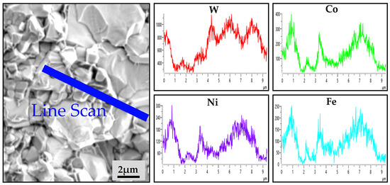 SEM-EDS line scan of cemented carbides with an additional Ni and Fe content of 2.4 wt.%.