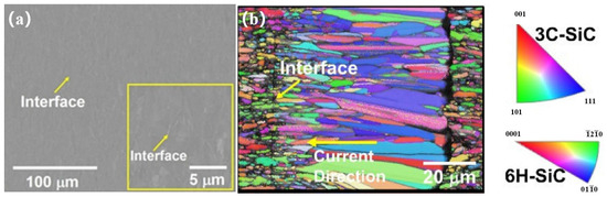 Microstructure of SiC direct bonding joint at 2160 °C for 1 min using Electric-Current-Assisted Bonding (ECAJ) technology. (a) SEM image; (b) EBSD analysis [26].