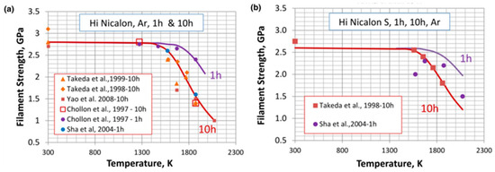The strength loss with temperature in an Ar gas environment for two types of fibers, (a) Hi Nicalon [32,33,34,35,36] and (b) Hi Nicalon S [30,33,36].
