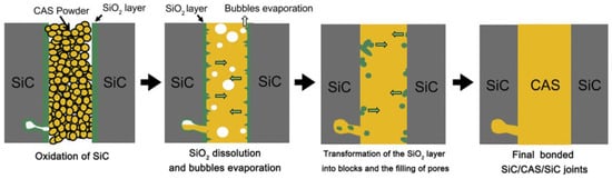 Glass-ceramic bonding aims to heat a glass ceramic so that the glass ceramic and the surface of the material that needs to be bonded achieve good penetration, and are finally tightly bonded together, then cools the glass ceramic and bonding materials to room temperature; glass ceramics can still be firmly combined with the required bonding materials. The mechanism of glass ceramic bonding is generally divided into four processes [64], as shown in Figure 7: the (1) oxidation of the SiC matrix, (2) dissolution and evaporation of SiO2, (3) transformation of SiO2 into bulk and pore filling, and (4) formation of uniform and dense SiC/glass ceramic/SiC joints.