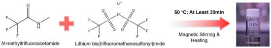 In this work, we report a new transparent DES based on N-methyltrifluoroacetamide as the HBD and LiTFSI as the HBA prepared by constant magnetic stirring and heating at 60 °C for at least 0.5 h (Figure 1). The formation of a DES system was analyzed by Fourier transform infrared spectroscopy (FT-IR). Differential scanning calorimetry (DSC) and thermogravimetric analysis (TGA) were conducted to evaluate the thermal properties of as-prepared DESs. In the liquid range of xLiTFSI = 0.2~0.33, a eutectic temperature of −84 °C can be determined at xLiTFSI = 0.2. The DES-4:1 and DES-3:1 exhibit a low viscosity and relatively high ionic conductivity in the liquid range. The variation of viscosity and ionic conductivity with temperature can be well described by the Vogel–Fulcher–Tammann (VFT) equations. Additionally, its non-flammability is also an advantage for its role as a potential candidate of electrolytes for energy storage systems.