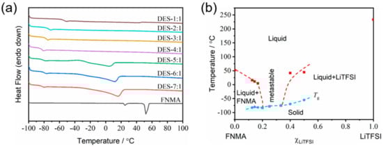 (a) DSC traces of the FNMA/LiTFSI system with various molar ratios during the heating scan from −100 to 100 °C, wherein the heating rate is 5 °C min−1 and the flow rate of nitrogen gas is 50 mL min−1. (b) Phase diagram of FNMA-LiTFSI binary system based on the as-prepared DESs with pure FNMA and pure LiTFSI at both ends, wherein Tm is marked with solid red squares, Tg with solid blue circles, and the dashed lines are plotted as guidance. The metastable region of xLiTFSI = 0.2~0.33 is noted, and the melting points of FNMA (52 °C) and LiTFSI (234 °C) are given.