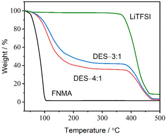 Furthermore, the thermal stability of the starting materials and the as-prepared DESs was characterized by thermogravimetric analysis (TGA). The TGA traces indicate that the onset temperatures (Tonset) of weight loss for pure FNMA and LiTFSI are 52 °C and 381 °C, respectively (Figure 3). However, the TGA traces for DES-4:1 display two weight loss events between 30 °C and 289 °C for the first stage (vaporization of FNMA; Tonset = 78 °C) and between 336 °C and 481 °C for the second stage (decomposition of LiTFSI; Tonset = 393 °C), proving that the studied DESs are mixtures of two components. As the LiTFSI ratio of the DESs increased from DES-4:1 to DES-3:1, Tonset of the weight loss increased from 78 °C to 81 °C for the first stage and from 393 °C to 396 °C for the second stage, respectively. The results demonstrate the higher thermal stability compared to pure FNMA due to the strong intermolecular interactions between FNMA and LiTFSI. The same is observed for DESs based on methyl carbamate (H2NCO2CH3) and lithium salts, which exhibited an increase of 30 °C in the decomposition temperature, indicating the formation of intermolecular interactions [18]. Hence, the decomposition temperature of each DES composition is influenced by the combination of the starting materials and molar ratios of the DESs.