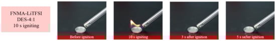 The flammability of DES-4:1 was tested by direct ignition for 10 s in air via a fire starter in a CR2032 battery case.