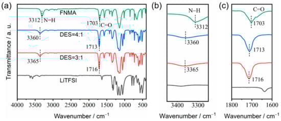 Fourier transform infrared (FT-IR) spectroscopy was used to analyze the formation mechanism of the DESs (Figure 5). The strong interaction of N-methyltrifluoroacetamide with LiTFSI can promote the dissociation of the lithium ions from anions to form the deep eutectic solution. The bands at 1703 cm−1 and 3312 cm−1 for N-methyltrifluoroacetamide can be attributed to the C=O stretching vibration and the N−H stretching vibration, respectively [18,19]. The DES-4:1 and DES-3:1 compositions both show blue shifts for the C=O and the N−H stretching vibrations. Especially, the C=O stretching vibration shifted to 1713 cm−1 (DES-4:1) and 1716 cm−1 (DES-3:1), and the N−H stretching vibration shifted to 3360 cm−1 (DES-4:1) and 3365 cm−1 (DES-3:1), respectively. This may be attributed to the Lewis base–acid interactions of C=O with free Li+ and the interactions of N−H with TFSI− anions to form intermolecular hydrogen bonds, weakening the existing N−H···O hydrogen bonds between the FNMA molecules. Therefore, FNMA acts as the hydrogen bond donor and LiTFSI as the hydrogen bond acceptor.