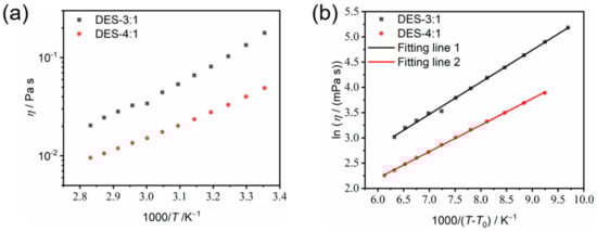 The Arrhenius (a) and VFT (b) plots of the temperature dependence of the dynamic viscosity of DES-3:1 and DES-4:1.