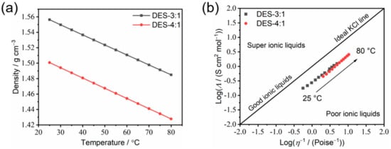 (a) The temperature-dependence of density; (b) the Walden plots of the DES-3:1 and DES-4:1 compositions from 25 °C to 80 °C. The dynamic viscosity data are taken from Figure 7a. The molar conductivity (Λ) is obtained by dividing the ionic conductivity (Figure 6a) by the molar concentration of LiTFSI based on the molar ratio of LiTFSI and the density of each DES (Figure 8a).