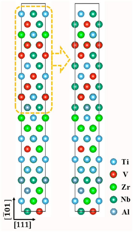 These supercell models consisting of 20, 20, and 14 atomic layers were designed to investigate the unstable stacking fault energies along three specific planes: {110}, {112}, and {123}. The slip direction for all models is uniformly set along the <111> direction. These three slip systems will be referred to as I, II, and III, respectively. Each layer contains four atoms. The atomic positions were permitted to relax exclusively along the direction that is perpendicular to the slipping planes. In terms of boundary conditions, an infinitely large structure is ideal for the calculations. However, it is a common practice in the first-principles calculation packages to repeat a finite size supercell infinitely with periodic boundary conditions (PBC) [27]. A schematic explanation is depicted in Figure 1. The Monte Carlo simulation was performed on the volume (i.e., the entire spatial domain) rather than on separate planes. The displacement of the 20-layer supercell shown in Figure 1 is used for GSFE calculations to elucidate the formation of stacking faults. The SFEs of the Ti–V–Zr–Nb–Al HEA for the above-mentioned three typical slip systems are calculated as follows [28]: