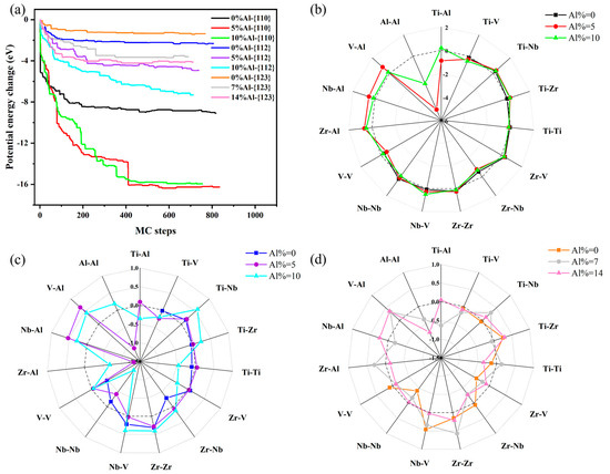 To investigate the effect of local chemical ordering on the SFE, it is necessary to build a realistic chemical SRO model of the Ti–V–Zr–Nb–Al HEA. In an earlier computational work [30], simulations using the DFT/MC method established chemical SRO results that showed agreement with experimental measurements. Therefore, in this work, we use the DFT/MC method to develop numerical models of Ti–V–Zr–Nb–Al high-entropy alloys with varying degrees of SRO. Specifically, we used DFT/MC simulations to investigate the SRO of the {110}, {112}, and {123} planes in BCC-structured Ti–V–Zr–Nb–Al HEA, as described in the Methods section. The most significant trends in the change of potential using DFT/MC are shown in Figure 2a The potential energy curves seem to converge, although the number of exchange trials with each atom is relatively small compared to those in the classical MC simulation.