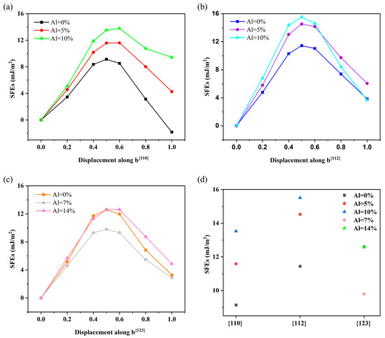 Stacking fault is equivalent to a movement of a crystal layer with a specific distance relative to its immediate neighbors, usually located along the closest-packed direction within the closest-packed plane. The atomic occupancy in the close-packed plane ideally does not change, so the most significant impact on the lattice must be the direction perpendicular to the stacking fault [31]. Based on this regulation and the change in system energy, we obtain the curve of GSFE versus the displacement of the upper parts. To demonstrate the visualization mechanism of the effect of Al content on the SFEs in Ti–V–Zr–Nb–Al HEA, we investigated the distribution of the unstable SFE in high-entropy alloys with different Al contents along three specific planes: {110}, {112}, and {123}.