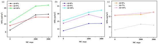 We calculated the variation in SFE of the {110}, {112}, and {123} planes in Ti–V–Zr–Nb–Al HEA with different Al contents as a function of the MC simulation steps. As shown in Figure 4a–c, the SFE curves tend to flatten when the MC simulation steps reach 2000–3000, indicating that the system structure reaches equilibrium. Based on this equilibrium state, we calculated the energy obtained from the structural optimization of SRO stacking structures for Ti–V–Zr–Nb–Al HEA with different Al contents, as shown in Figure 4a–c.