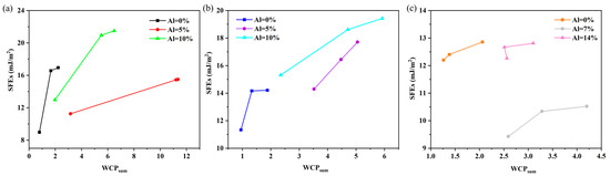 The SFE of the {110}, {112}, and {123} planes of Ti–V–Zr–Nb–Al HEA with different Al contents can be quantitatively correlated with the degree of chemical SRO, reflected by the total non-proportional number of local atomic pairs, WCPsum, as shown in Figure 5a–c, respectively. For most HEAs, the more significant the WCPsum, the more ordered the samples, and the higher the SFE; that is, the SFE increases gradually with the increase in the SRO of the HEA. Recent work [13,35] has proven that the presence of SRO affects the periodic Peierls–Nabarro energy barriers and SFE distribution, thus giving rise to considerable fluctuated lattice resistance, complex dislocation maneuvers, and TWIP/TRIP behaviors in HEAs. This finding appears to imply that the experimentally studied SRO affects the variation in the SFE of the HEA, which falls within the range investigated by our DFT calculation, and researchers can adjust the performance change in the HEA by adjusting the change in the SRO.