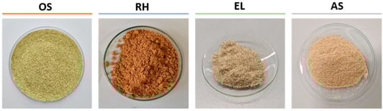 Plant-based by-products—oregano stalks (OS), rice husk (RH), eucalyptus leaves (EL), and almond shells (AS)—at their final granulometry of 0.25 mm.