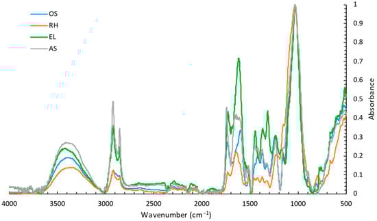 FTIR-ATR absorption spectra of the plant-based by-products, oregano stalks (OS), rice husk (RH), eucalyptus leaves (EL), and almond shells (AS).