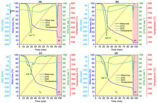 The thermal stability and behaviour were assessed by TGA-DSC. The resulting TGA-DSC profiles, along with the first derivative of the TG curves (DTG), are presented in Figure 3. Furthermore, the inert atmosphere (N2) is marked in the yellow-shaded region and the oxidative atmosphere (air) in the pink-shaded region. The peaks observed in the DTG curve correspond to the inflection points of the TG curves, indicating mass loss events. By calculating the minimum point of each DTG peak, it was possible to determine the temperature at which the mass loss occurred.