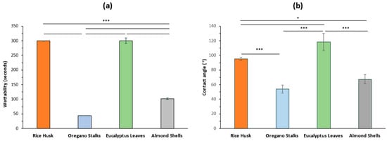 Time taken by the by-products to penetrate the water surface in wettability tests (a) and contact angle measurements of the residues (b). Results are presented as mean ± SD, and statistical differences are noted as * p < 0.05, *** p < 0.001.