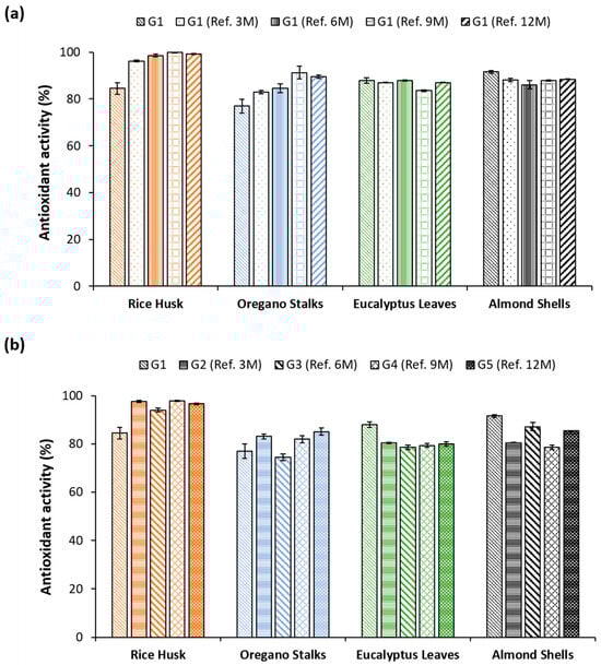 The antioxidant activity of plant-based by-products ground at day 0 (G1) and measured after 3 (G1 Ref. 3M), 6 (G1 Ref. 6M), 9 (G1 Ref. 9M), and 12 (G1 Ref. 12M) months (a). Antioxidant activity of the same residues milled only on assay day and stored for 3 (G2 Ref. 3M), 6 (G3 Ref. 6M), 9 (G4 Ref. 9M), and 12 (G5 Ref. 12M) months (b). Results are expressed in a percentage of the ABTS•+ inhibition and refer to the mean and standard deviation.