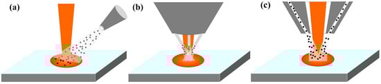 Different types of powder feeding nozzle: (a) Off-axial nozzle. (b) Discrete coaxial nozzle. (c) Annular coaxial nozzle.