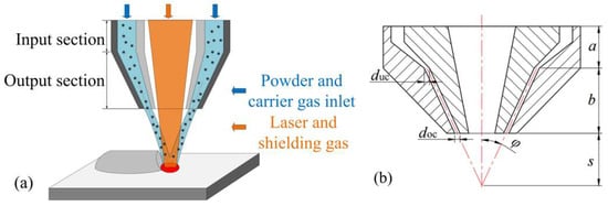 The internal powder feeding structure of the annular nozzle is divided into the input section (IS) and output section (OS) in the vertical direction, as shown in Figure 2a. Based on this, the characteristic structure of the OS analyzed in this paper includes the size of powder feeding inclination φ and gaps duc and doc, shown in Figure 2b, and s is the nozzle working distance. With the different sizes of gaps duc and doc, the angle between the inner and outer cones of the OS part also changes, and the outlet shape can be divided into three types, which are contraction type (duc > doc), parallel type (duc = doc), and divergent type (duc < doc).