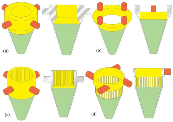 The IS of the annular nozzle mainly explores the influence of different inlet shape structures on powder aggregation. This paper establishes an analysis model based on four common inlet shapes, as shown in Figure 3, which are the fluid domain geometric models of the internal powder delivery channels of the four annular nozzles, namely (a) with a powder storage chamber structure [28], (b) with the same outlet shape [29], (c) with a corrected direct-current groove on the inner conical wall of the nozzle [30], and (d) with a rectifier tube structure [19,20].