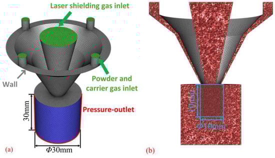 During the laser deposition manufacturing process, the nozzle powder delivery channel’s structure, the characteristics of the powder particles, and the gas rate jointly determine the motion state of the powder particles after ejection from the bottom of the nozzle and then affect the powder convergence effect. In order to analyze the influence of the above factors on the powder convergence effect, this paper simulates the powder convergence of the annular nozzle based on the commercial fluid dynamics analysis software Fluent 2020 R2, and Fluent meshing was used to mesh the model of the annular nozzle. The minimum grid size of the whole model is set to 0.2 mm, and the maximum grid size is set to 1 mm. The part shown in Figure 4 is partially encrypted with the grid, and the grid size is unified to 0.2 mm. The overall number of grids is about 2.28 million. In order to simulate the natural environment and characterize the dynamic characteristics of the powder particles after they are ejected from the nozzle, a blue cylindrical area with a diameter of 30 mm was set at the bottom of the powder feeding nozzle. The surrounding boundary is set as the pressure outlet (blue area in Figure 4a), and the inlet plane of the powder feeding structure is set as the velocity inlet boundary condition (green area in Figure 4b). Other dimensional parameters of each part are shown in Table 1.