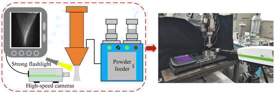 In this experiment, coaxial powder feeding additive manufacturing equipment was used. A strong flashlight is used to illuminate the powder flow after ejection from the annular nozzle, and a high-speed camera (Model i-SPEED 3, Dalian Yuanlong Testing Instrument Co., Ltd., Dalian, China) is used to photograph the morphology of the powder flow. During the process of the experiment, the powder particle size range used is 15–53 μm, the material is TC4, the density is 4.5 g/cm3, laser shielding gas is set to 1 L/min, and carrier gas flow on the powder feeder is set to 3 L/min. The internal structure parameters of the annular nozzle in the figure are shown in Table 4.