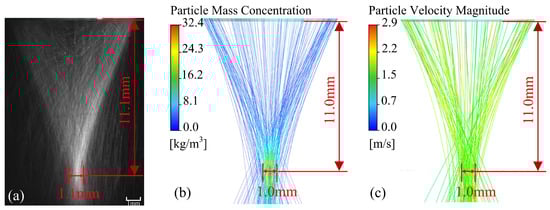 In order to validate the simulation model, the simulation results are compared with the experimental shooting results, as shown in Figure 6. Figure 6a shows the powder flow morphology captured by a high-speed camera, Figure 6b,c depict the trajectories of powder particles colored by concentration and the magnitude of velocity, respectively. The actual location of the powder convergence and the size of the powder waist diameter measured in the experiment are compared with the simulation results; however, since the specific location where the powder concentration reaches 86.5% could not be determined, the powder waist diameter measured in the experiment is inconsistent with the powder waist diameter defined in the subsequent simulation analysis. Good consistency is obtained through quantitative verification and comparison. Indicating that the simulation model can well describe the dynamic behavior of powder particles inside the nozzle and during the convergence process.