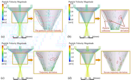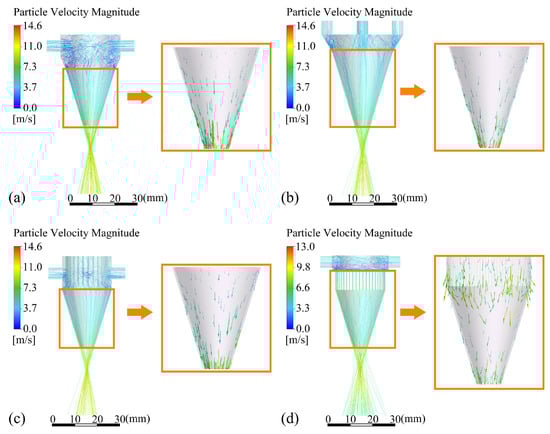 Particle trajectories and velocity vectors of powder with different inlet shapes: (a) Case a, (b) Case b, (c) Case c, and (d) Case d.